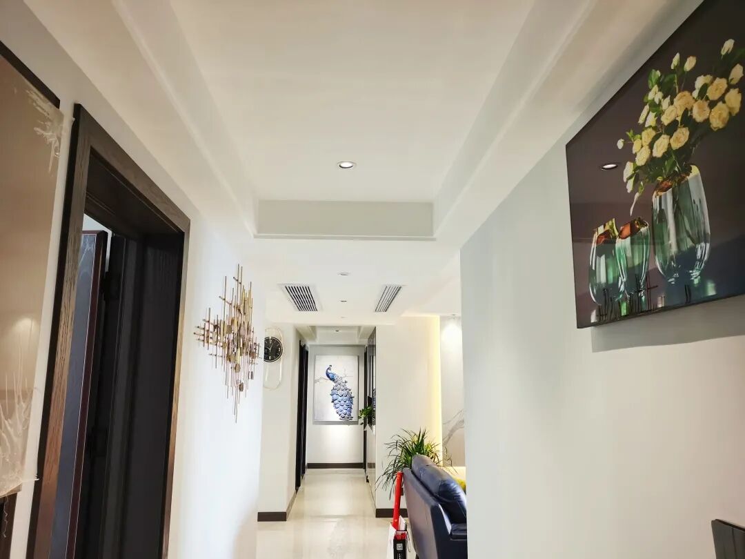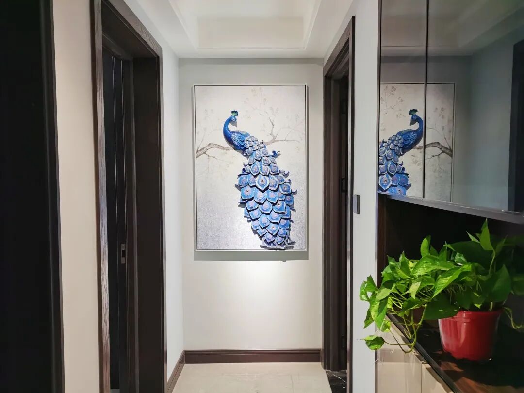 在走廊右側置入了一整面多功能儲物柜,把收納功能完美融入?yún)s又不顯突兀。盡頭懸掛孔雀圖是非常不錯的選擇,孔雀是吉祥幸福,善良美麗的象征,代表著家庭的和睦的寓意。